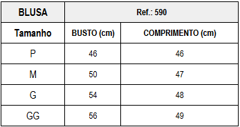 - Vestindo 36/38 (P) | 40 (M) | 42 (G) | 44 (GG)