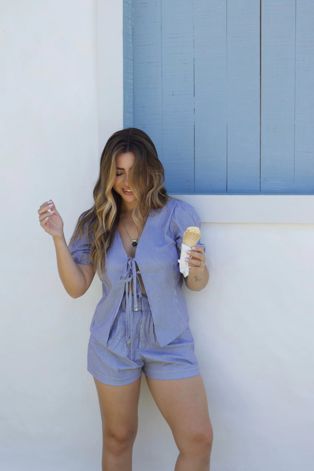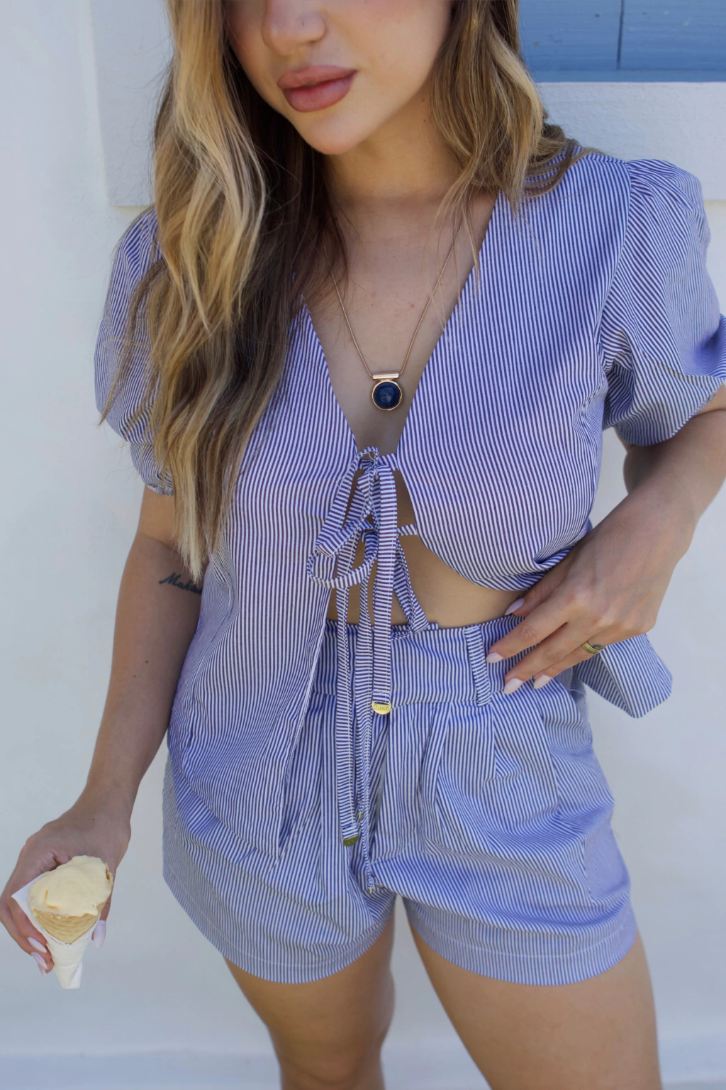 Detalhes do Design: blusa leve com padronagem de listras finas, possui mangas curtas levemente bufantes, decote em V profundo e detalhe frontal com amarração dupla, criando um recorte sutil e moderno na região do busto. A modelagem soltinha garante conforto e o tecido bem estruturado traz sofisticação e frescor ao look.