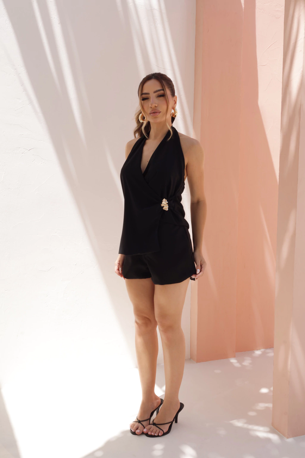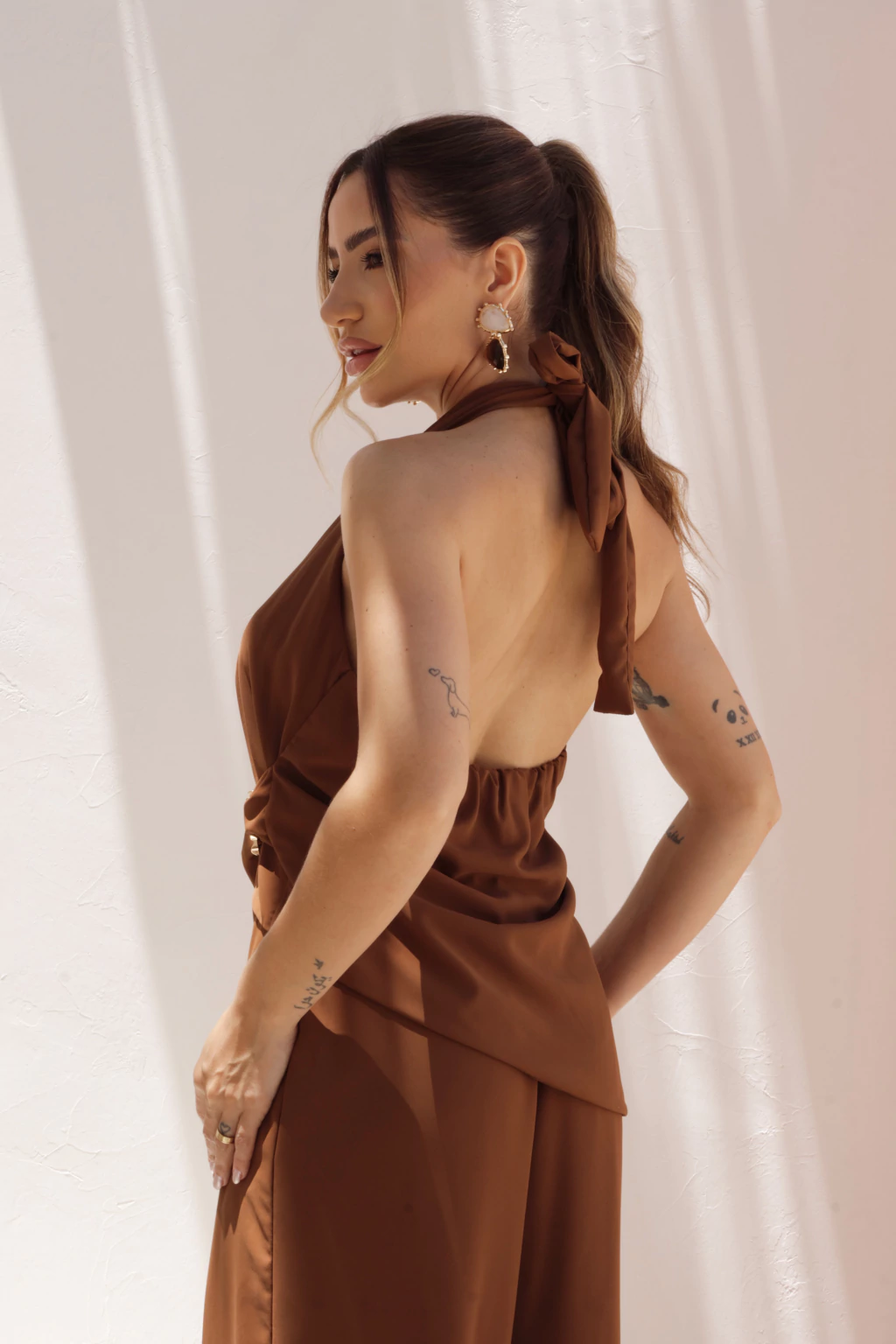 Detalhes do Design: modelagem halter, com decote em V e amarrações no pescoço. Apresenta um design transpassado na frente, que é preso por um aviamento dourado na lateral, criando um caimento assimétrico e fluido. A parte de trás é aberta e possui um elástico na região das costas para um ajuste mais confortável.