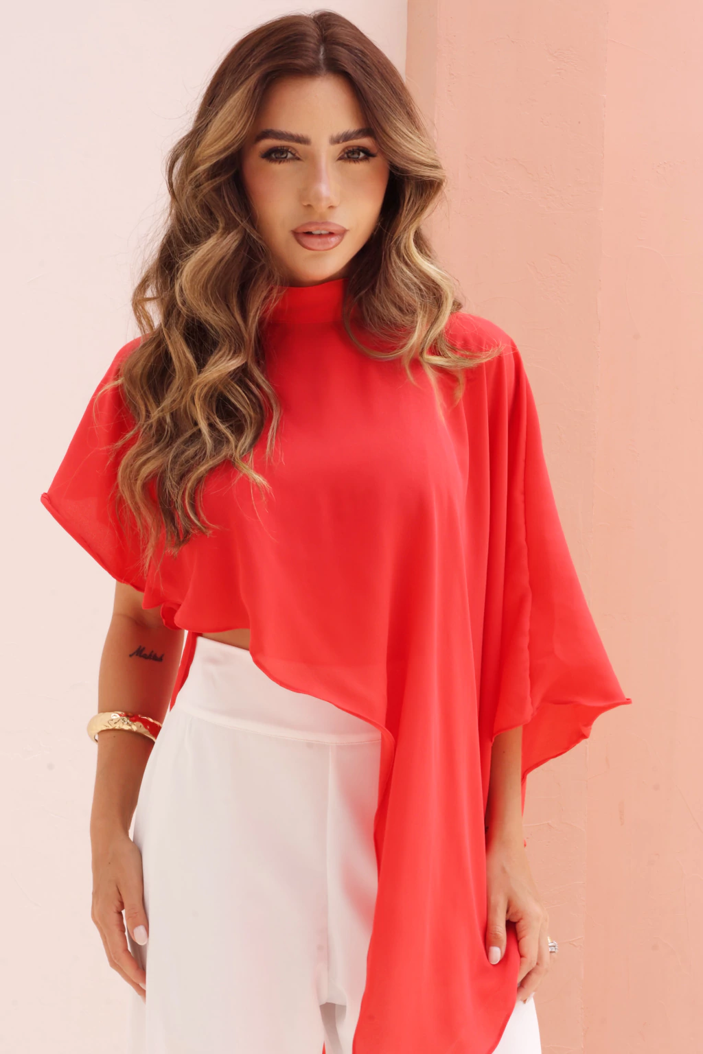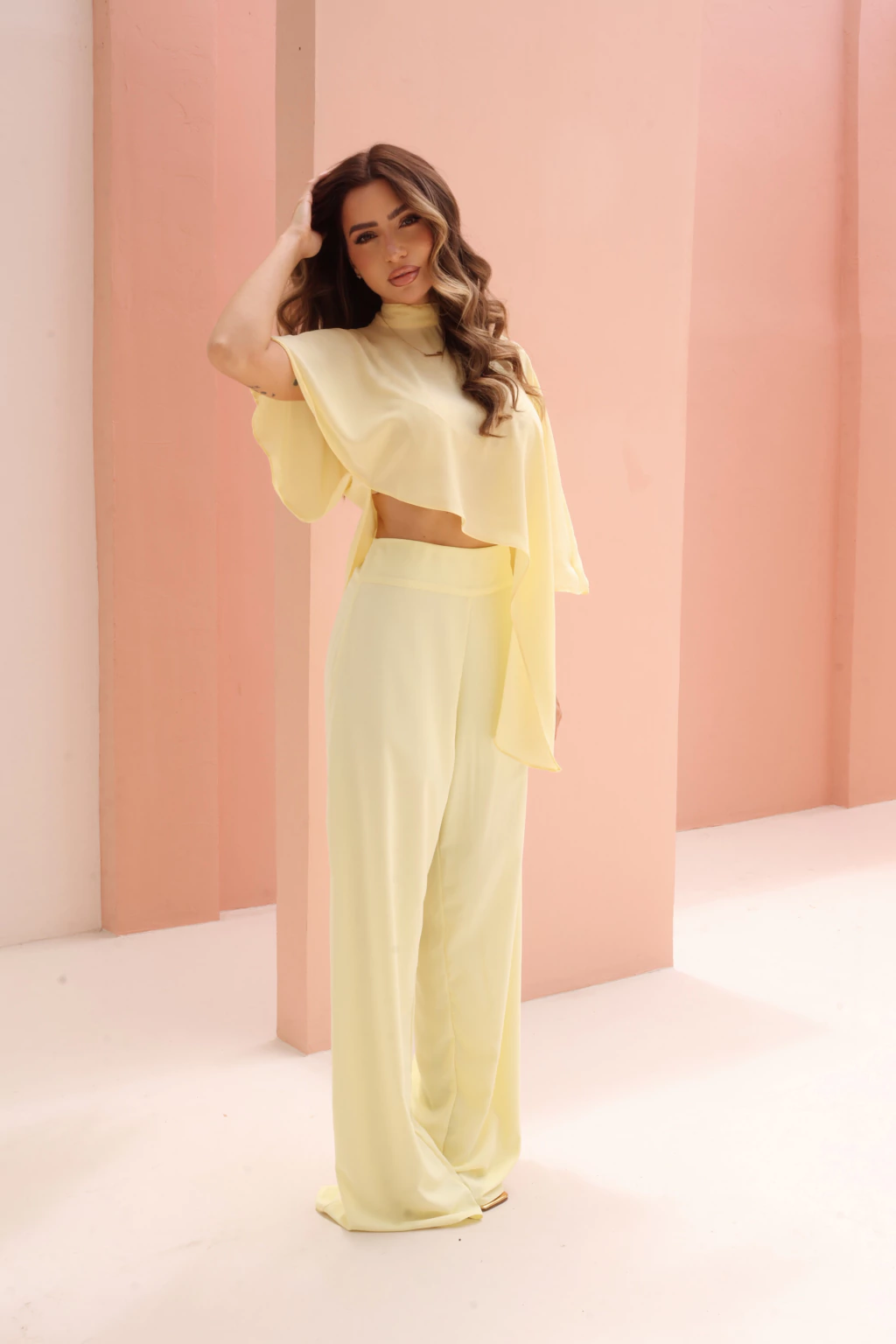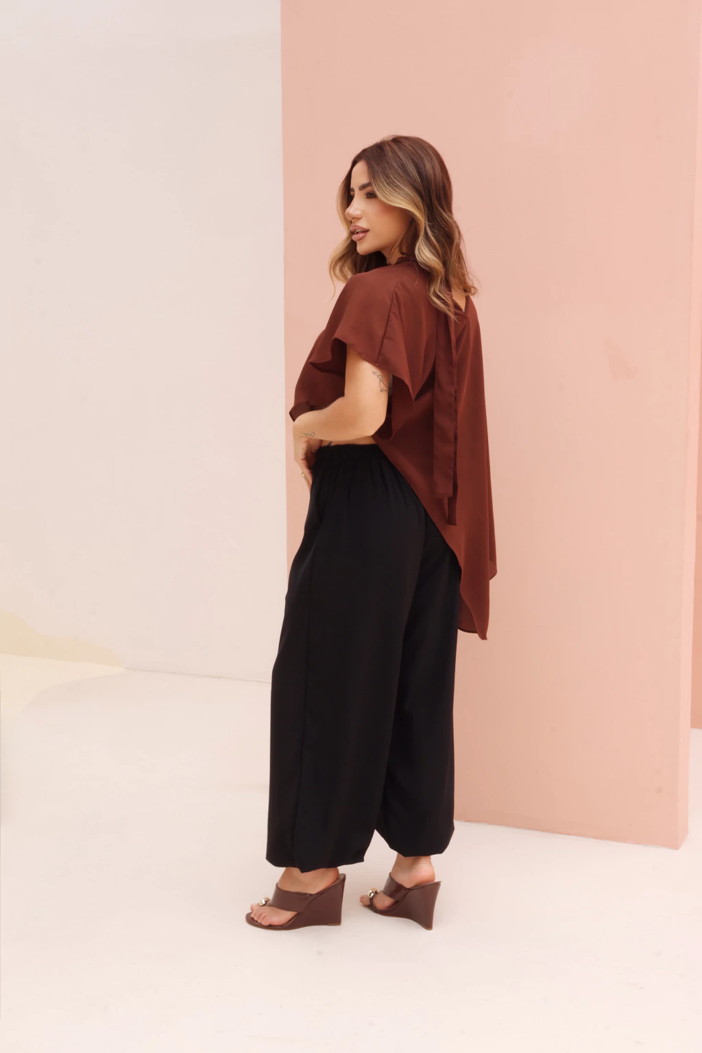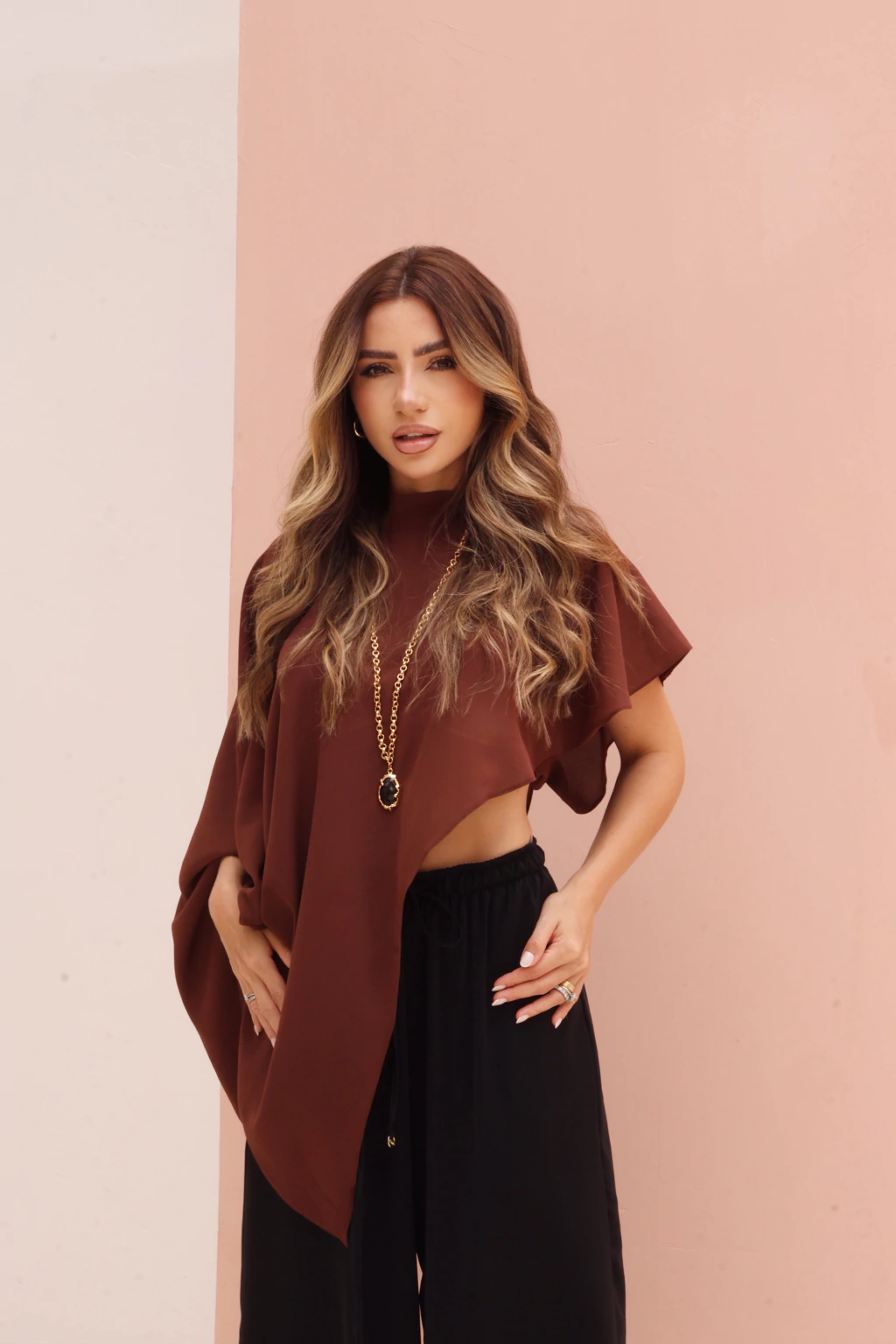 Detalhes do Design: na parte da frente e na lateral, a modelagem assimétrica apresenta pontas alongadas, que criam um caimento fluido e elegante. A gola alta estruturada possui amarração na parte de trás, proporcionando um ajuste delicado. As mangas são soltas e amplas, e há um recorte lateral na cintura que fica à mostra de forma sutil, criando um contraste entre fluidez do tecido e a valorização da silhueta.