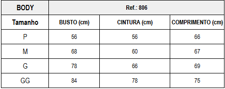 - Vestindo: 36/38 (P) | 40 (M) | 42 (G) | 44 (GG)