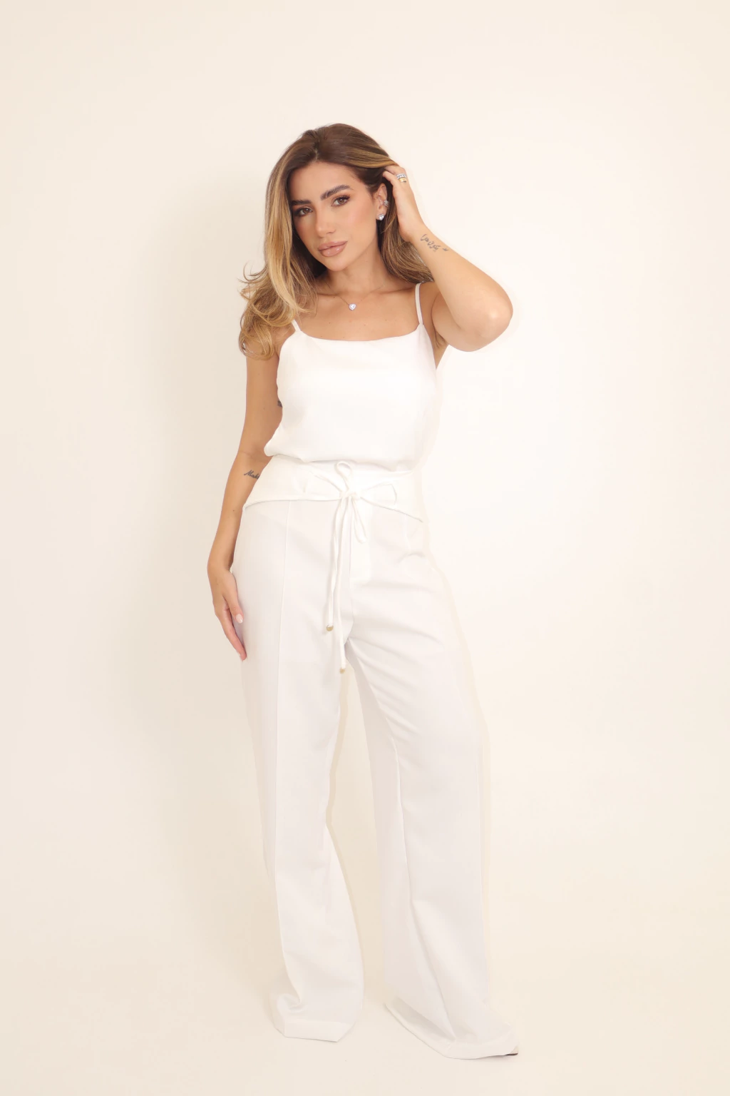 Detalhes do Design: modelagem pantalona, com pernas amplas e caimento solto do quadril até a barra, criando um visual fluido e elegante. Cintura alta com faixa embutida do mesmo tecido, ajustada por amarração frontal com ponteiras personalizadas. Na parte frontal, apresenta um detalhe de braguilha fake, mantendo a estética da peça clean, moderno, fresh e refinado.