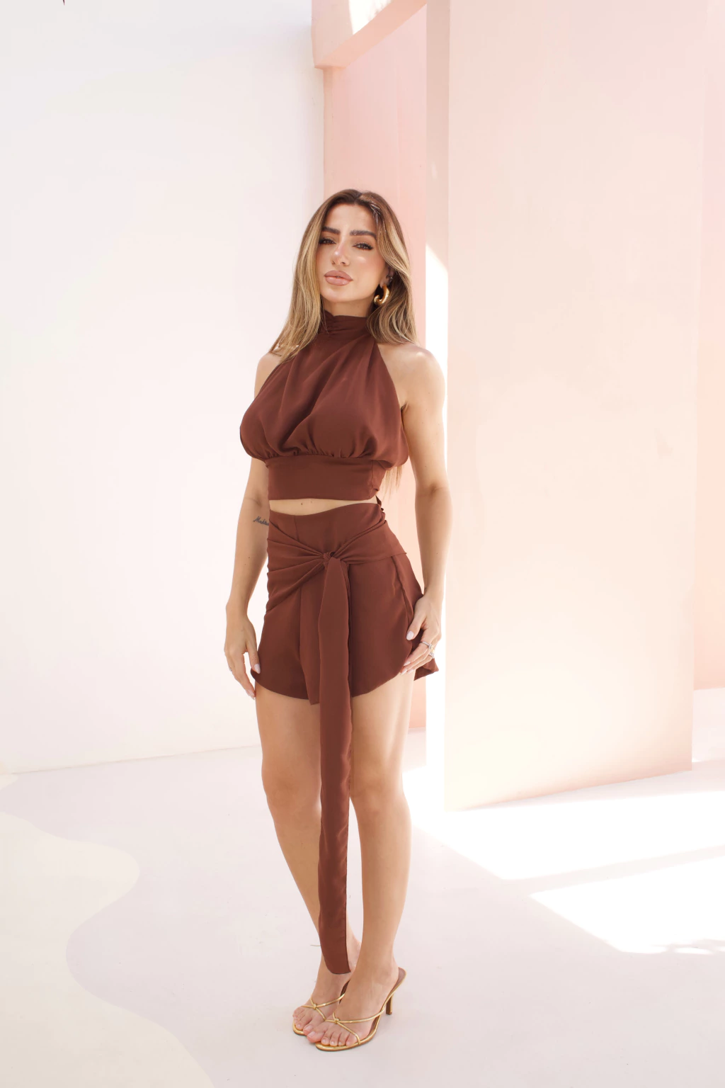 Detalhes do Design: decote halter, gola alta com amarração no pescoço, a parte frontal tem drapeado suave, criando um caimento fluido e volumoso no busto. As costas são abertas, e a sustentação é feita por duas faixas longas que amarram no pescoço e uma faixa adicional que amarra na parte inferior das costas.
