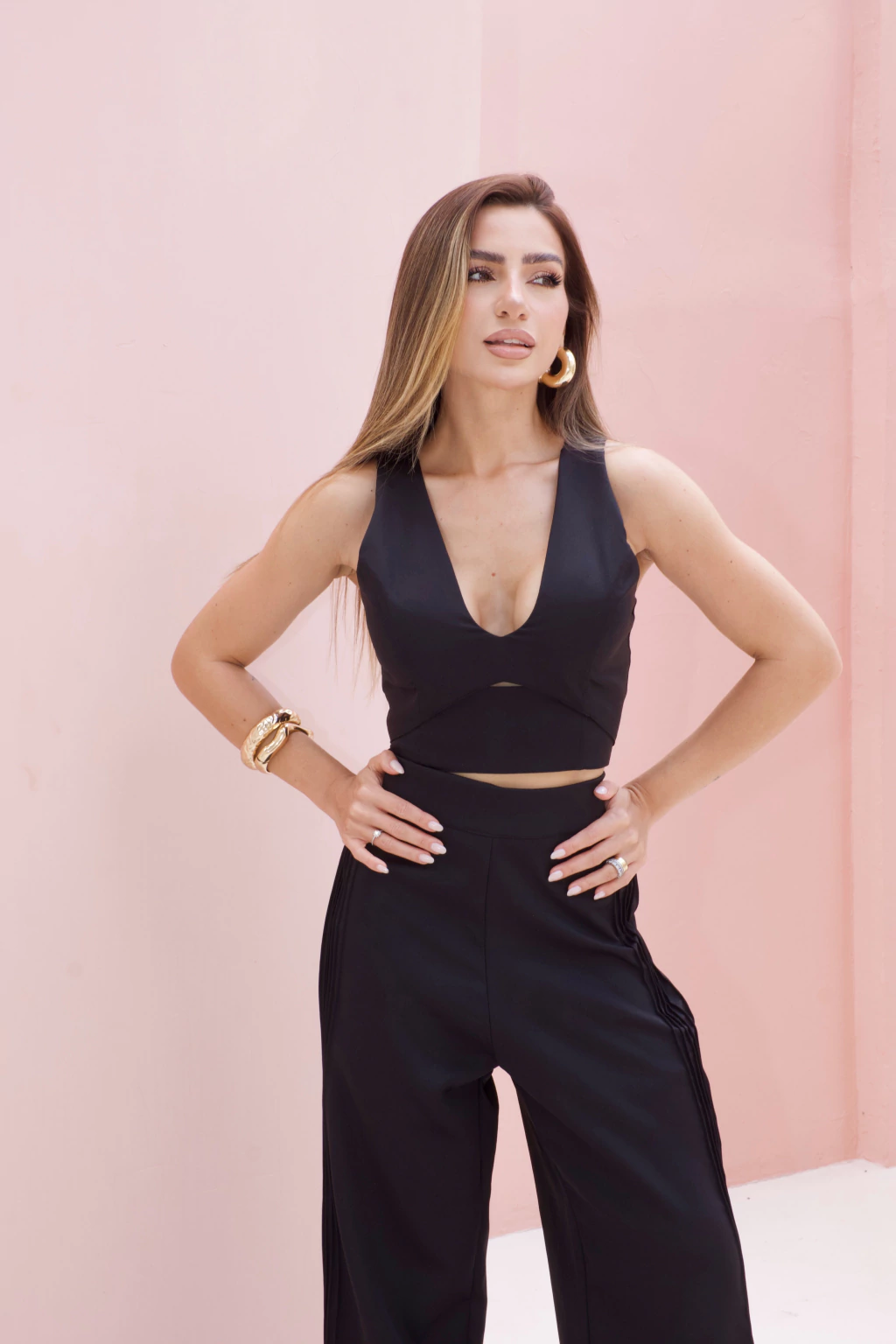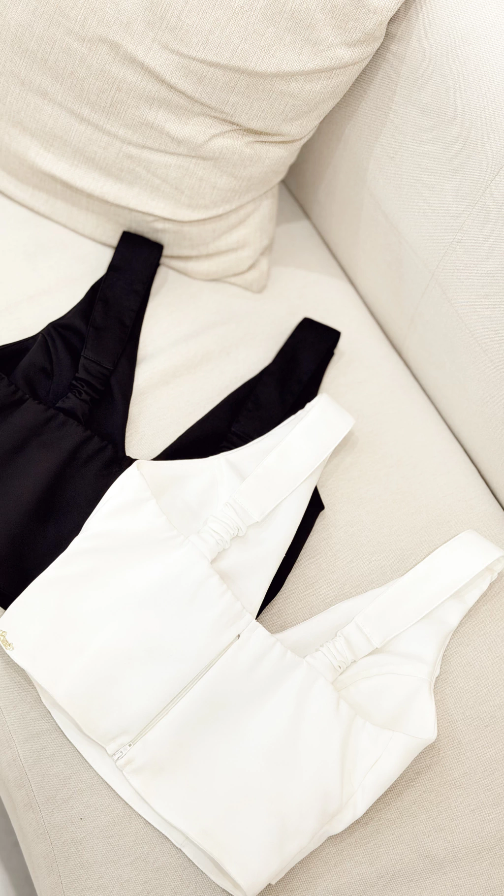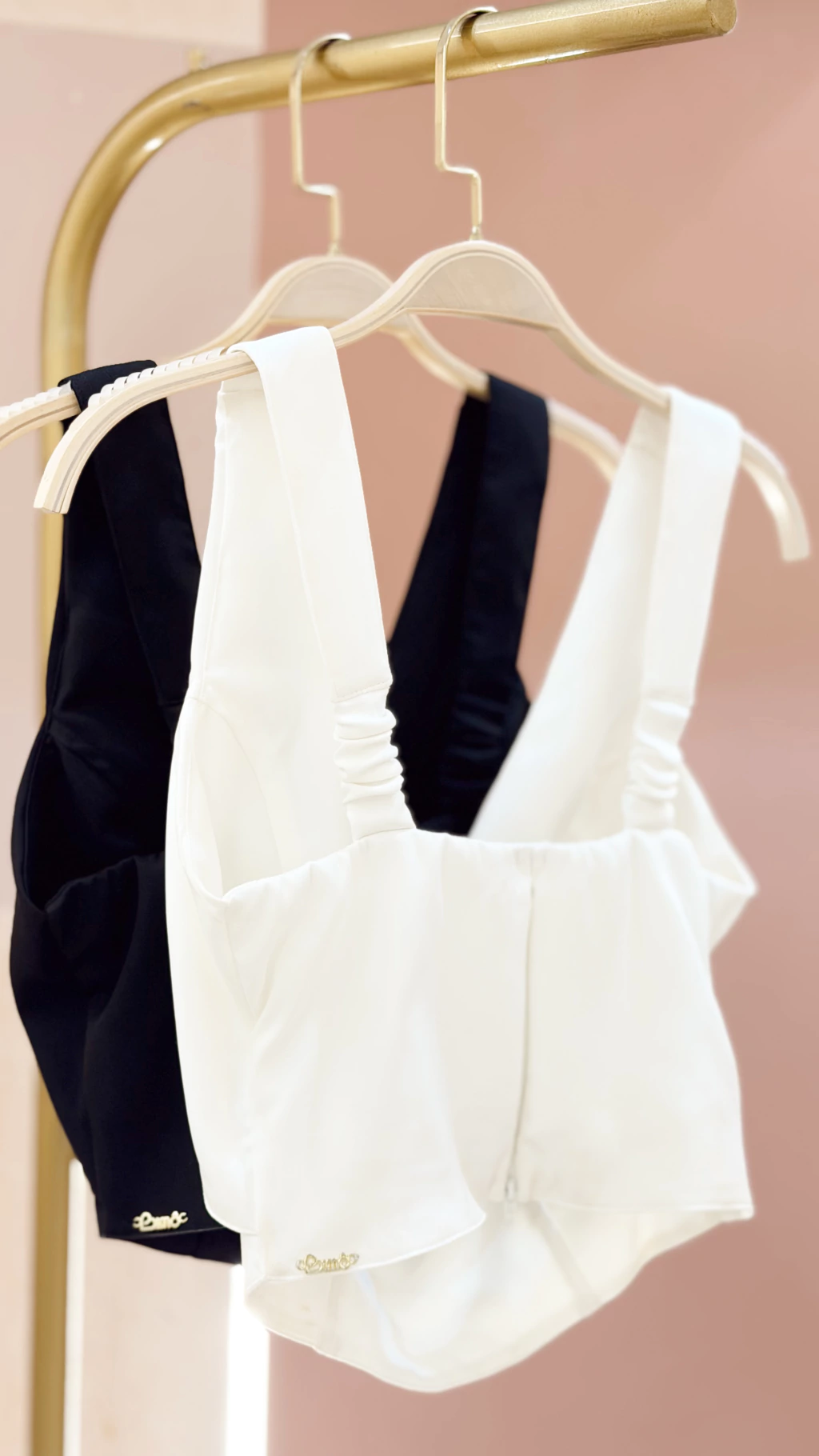 Detalhes do design: modelagem mais estruturada, criando efeito de sustentação. Apresenta decote V profundo, que alonga o colo, e recorte cut-out central, destacando a silhueta. As laterais do cropped têm recortes que acompanham o busto, proporcionando um caimento anatômico, e o fechamento é feito por zíper na parte de trás.