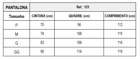 - Vestindo 34/36 (P) | 38 (M) | 42 (G) | 44 (GG)