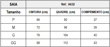 - Vestindo: 34/36 (P) | 38/40 (M) | 42 (G) | 44 (GG)