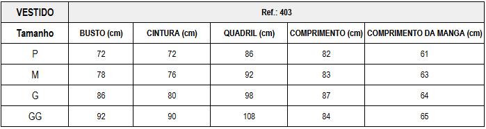- Vestindo: 36/38 (P) | 40 (M) | 42 (G) | 44 (GG)