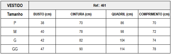 - Vestindo: 34/36 (P) | 38 (M) | 40 (G) | 42 (GG)
